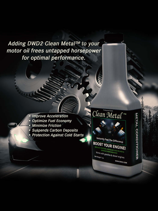 DWD2 Clean Metal - Metal Conditioner and performance Motor Oil Additive: DWD2 Metal Conditioner is the ultimate oil treatment additive for your engine! Our advanced nano-technology penetrates deep into the pores of your engine's metal components, acting as a cushion between moving parts and reducing friction. This unique formulation coats and restores your engine's life, helping it run at peak efficiency.